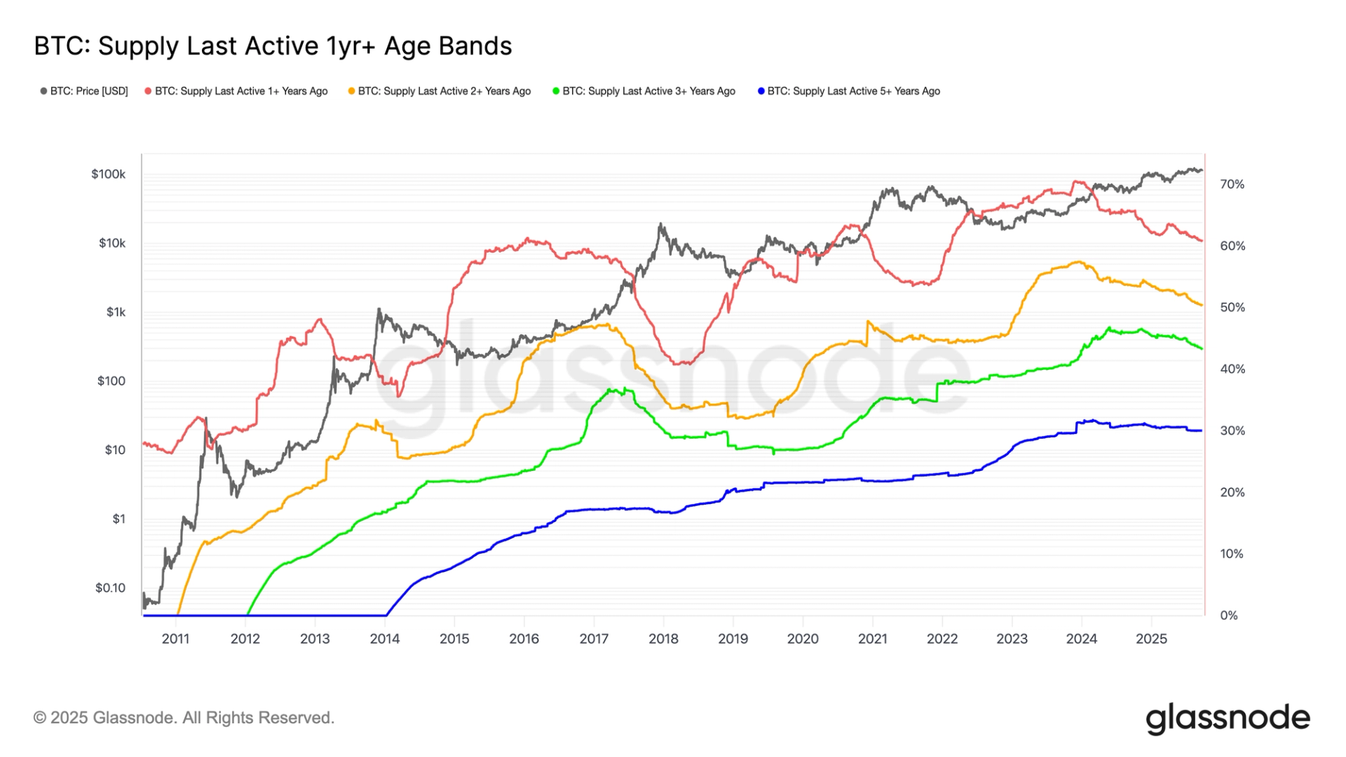 Looking at long-term holder supply, the percent of circulating supply unmoved for at least 1 year has dropped sharply from 70% to 60%. The peak was in November 2023, when bitcoin traded near $40,000. At the same time, 2+ year holders also began to sell, with their share declining from 57% to 52%.