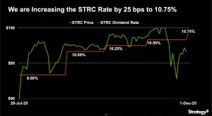 The company lifted STRC’s payout after the preferred stock again slipped below its $100 par value.