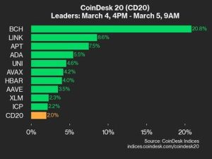 CoinDesk Indices presents its daily market update, highlighting the performance of leaders and laggards in the CoinDesk 20 Index. The