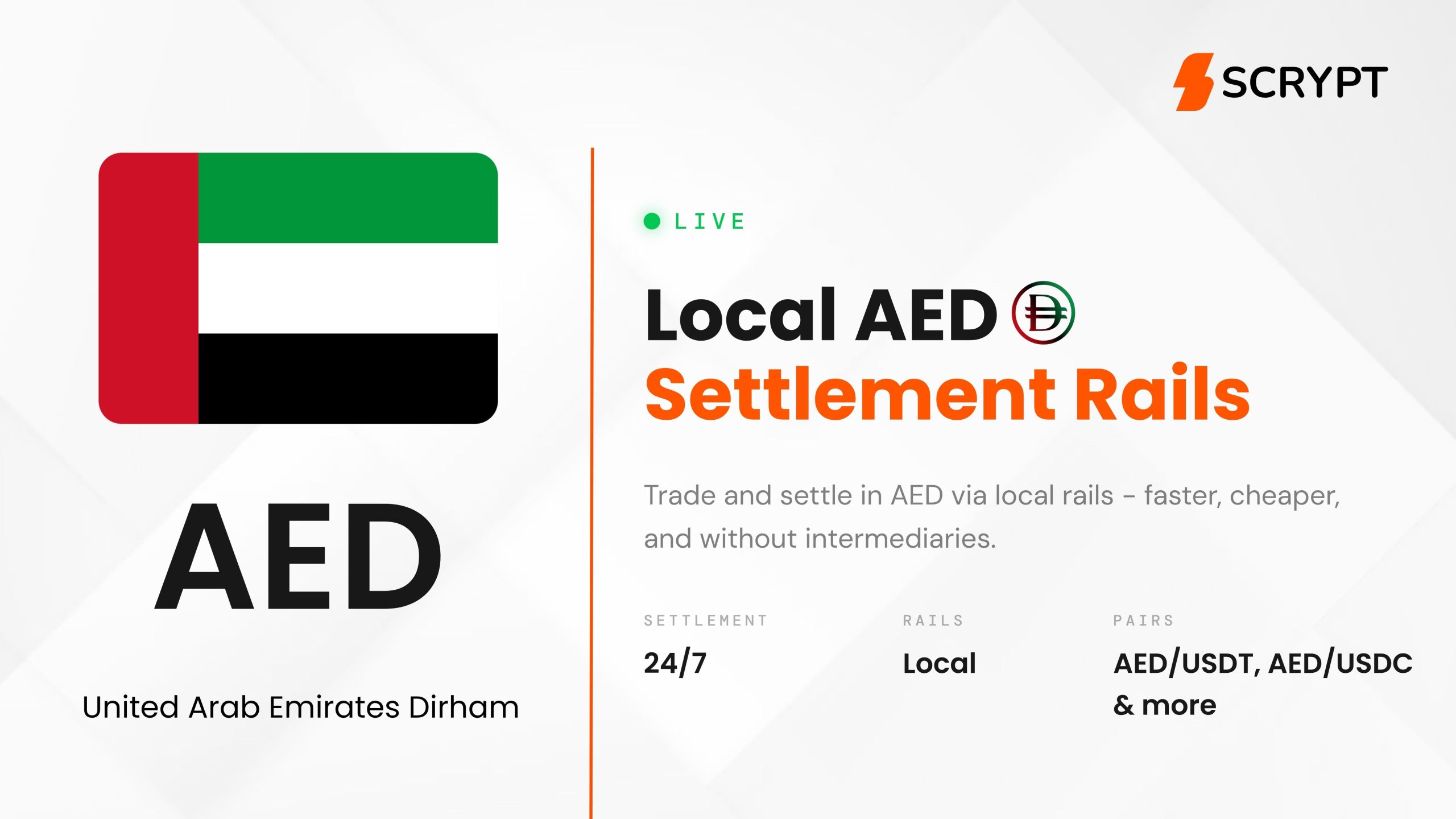 The addition of Local AED strengthens SCRYPT’s robust cross-border settlement infrastructure, which already supports seamless 24/7 automated settlements in EUR, USD, GBP, CHF, SGD, BRL, AUD and additional fiat currencies.